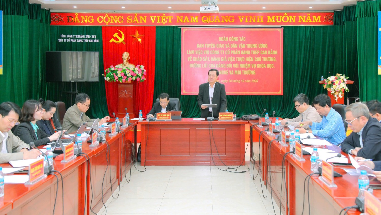 Tại buổi khảo sát, Đoàn công tác đã nghe đại diện lãnh đạo Công ty cổ phần Gang thép Cao Bằng báo cáo tình hình triển khai chủ trương, đường lối của Đảng về Nghị quyết số 57-NQ/TW, ngày 22/12/2024 của Bộ Chính trị về đột phá phát triển khoa học công nghệ, đổi mới sáng tạo và chuyển đổi số quốc gia (Nghị quyết số 57-NQ/TW); Kết luận số 81-KL/TW ngày 04/6/2024 của Bộ Chính trị về tiếp tục thực hiện Nghị quyết số 24-NQ/TW về chủ động ứng phó với biến đổi khí hậu, tăng cường quản lý tài nguyên và bảo vệ môi trường (Kết luận số 81-KL/TW; tình hình về sản xuất chuyển đổi xanh và bảo vệ môi trường tại tại đơn vị trong thời gian qua. Trong những năm qua, Công ty Cổ phần Gang thép Cao Bằng triển khai đồng bộ nhiều giải pháp về chuyển đổi số và chuyển đổi xanh, góp phần phát triển bền vững doanh nghiệp và kinh tế địa phương. Hiện nay, Công ty có gần 700 lao động; quản lý và vận hành 02 dự án trọng điểm gồm: Khu liên hợp Gang thép Cao Bằng với tổng mức đầu tư trên 1.900 tỷ đồng, tổng công suất thiết kế là 220.000 tấn phôi thép/năm; Dự án đầu tư khai thác lộ thiên mỏ sắt Nà Rụa công suất đạt 350.000 tấn/năm. Hằng năm, Công ty nộp ngân sách nhà nước hơn 60 tỷ đồng, góp phần phát triển kinh tế, đảm bảo an sinh xã hội và bảo vệ môi trường trên địa bàn tỉnh.