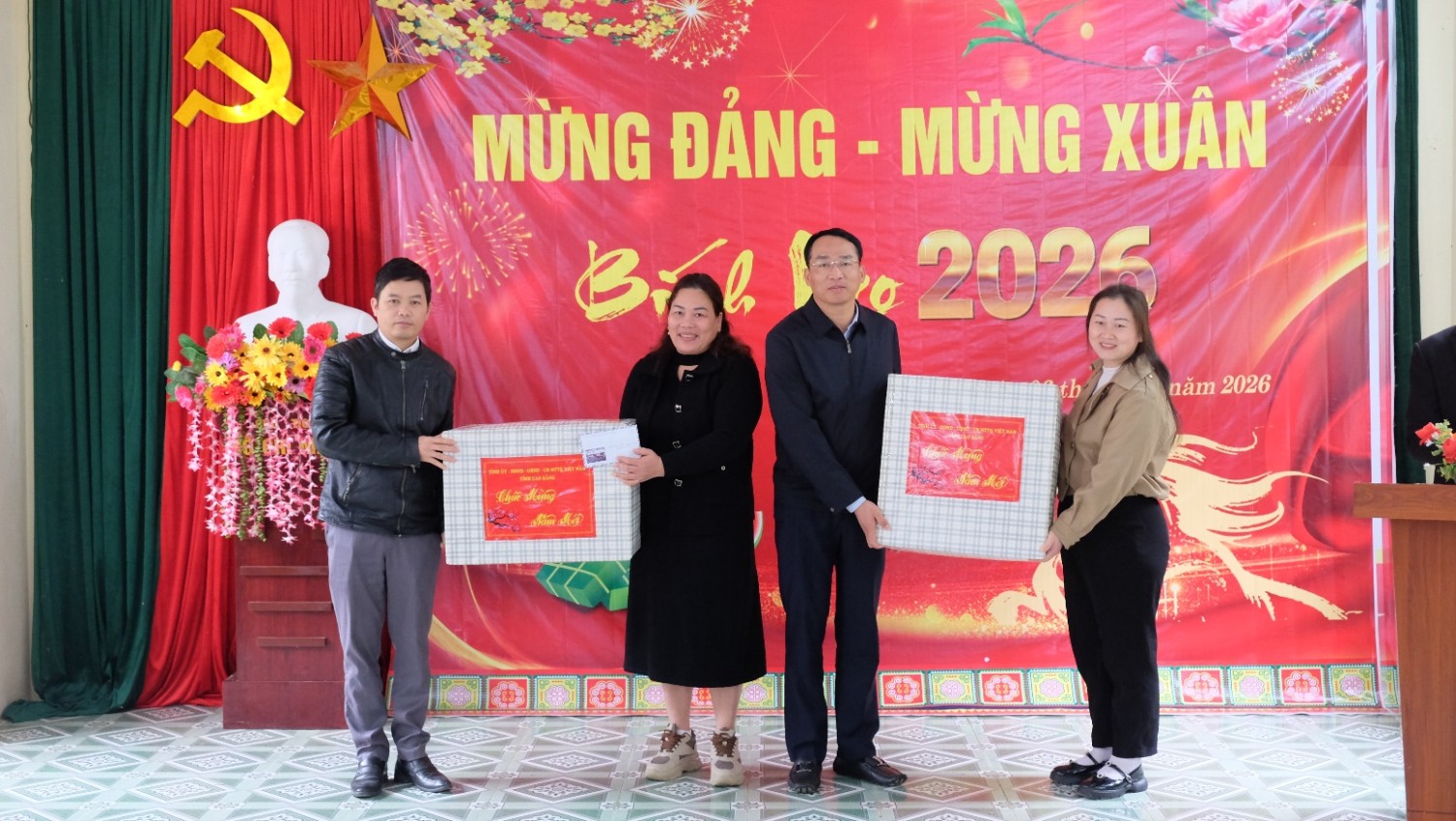 Đ/c Đoàn Trọng Hùng, Tỉnh uỷ viên, Giám đốc Sở Tư pháp và đ/c Bế Trung Dũng, Trưởng phòng Khoa giáo, VHVN, Ban Tuyên giáo và Dân vận Tỉnh uỷ trao tặng quà Tết cho điểm trường Tiểu học và Mầm non tại xóm Sác Ngà