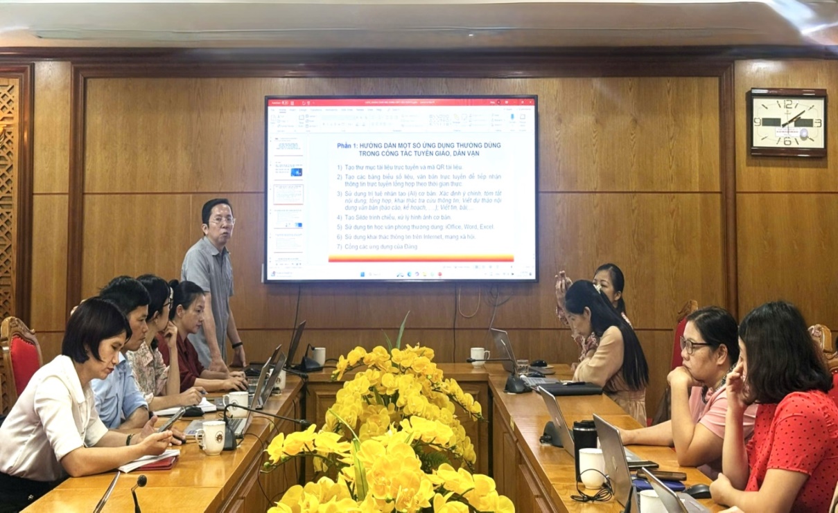 Công tác đào tạo, bồi dưỡng nâng cao trình độ công nghệ thông tin, chuyển đổi số cho cán bộ, công chức của Ban tiếp tục được quan tâm triển khai thực hiện; 100% cán bộ, công chức của Ban được tham gia tập huấn, bồi dưỡng kiến thức, kỹ năng cơ bản về ứng dụng trí tuệ nhân tạo (AI) trong công tác do Văn phòng Trung ương Đảng tổ chức; 03 công chức tham gia lớp bồi dưỡng trí tuệ nhân tạo tại Trung Quốc; cung cấp tài liệu, sổ tay chuyển đổi số do Ban Tuyên giáo và Dân vận Trung ương biên soạn, phát hành bản điện tử để cán bộ, công chức của Ban chủ động nghiên cứu, học tập; tổ chức sinh hoạt chuyên đề chuyển đổi số trong công tác tuyên giáo và dân vận nhằm nâng cao nhận thức và kỹ năng ứng dụng công nghệ thông tin cho đội ngũ cán bộ, công chức, đây là một hoạt động cụ thể nhằm triển khai mô hình “Dân vận khéo” năm 2025 của Chi bộ Ban Tuyên giáo và Dân vận Tỉnh uỷ với chủ đề “Khéo trong công tác tuyên truyền, vận động cán bộ, đảng viên Chi bộ Ban Tuyên giáo và Dân vận Tỉnh uỷ thực hiện chuyển đổi số, ứng dụng khoa học công nghệ trong thực hiện nhiệm vụ, nâng cao chất lượng công tác tham mưu, đề xuất”.