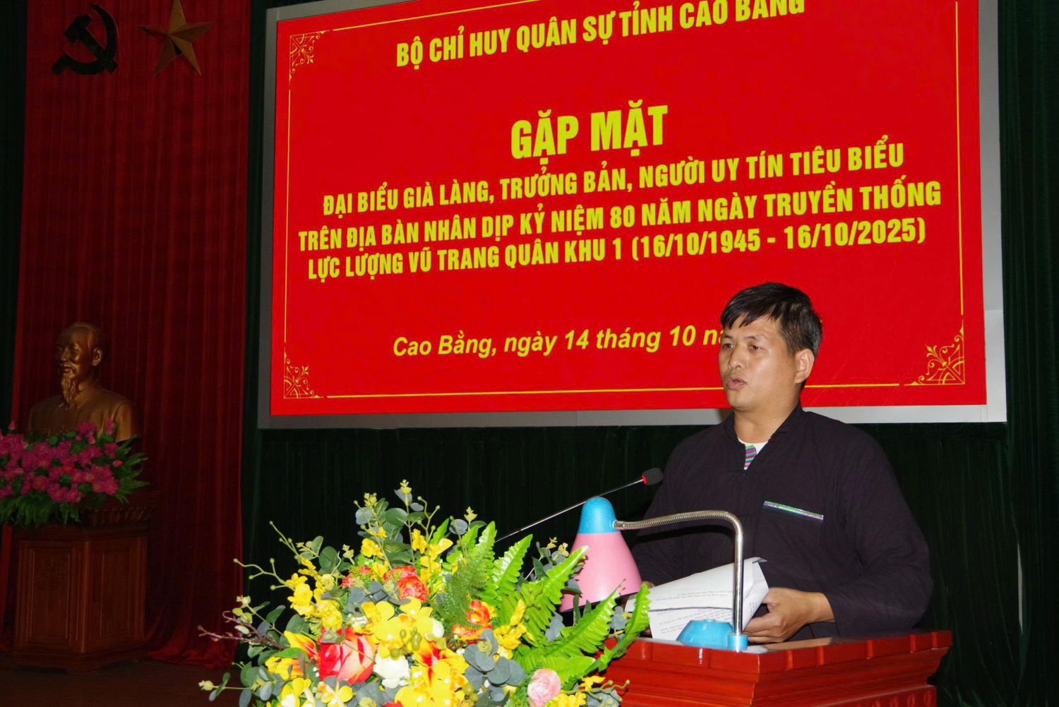 Lắng nghe, ghi nhận những ý kiến đóng góp của các đại biểu tại buổi gặp mặt, Đại tá Phương Nam Ký, Chính uỷ Bộ CHQS tỉnh khẳng định: Đây là những ý kiến đóng góp quý báu đối với công tác quân sự, quốc phòng địa phương; Bộ CHQS tỉnh sẽ tiếp thu và vận dụng triển khai vào thực tế hoạt động của lực lượng vũ trang tỉnh trong thực hiện nhiệm vụ để phát huy tốt hơn nữa mối quan hệ đoàn kết, gắn bó giữa già làng, trưởng bản, người có uy tín tiêu biểu trong vùng đồng bào dân tộc thiểu số với lực lượng vũ trang tỉnh. Đồng thời, mong muốn trong thời gian tới, các già làng, trưởng bản, người có uy tín trên địa bàn tỉnh tiếp tục đồng hành cùng cấp ủy, chính quyền, LLVT tỉnh phối hợp thực hiện có hiệu quả các chương trình phát triển kinh tế, văn hóa - xã hội, luôn gương mẫu đi đầu vận động đồng bào các dân tộc trong xây dựng nền quốc phòng toàn dân gắn với thế trận an ninh nhân dân vững chắc; xây dựng tinh thần đoàn kết toàn dân tộc, đoàn kết quân dân, góp phần xây dựng quê hương Cao Bằng ngày càng giàu đẹp và phát triển bền vững.