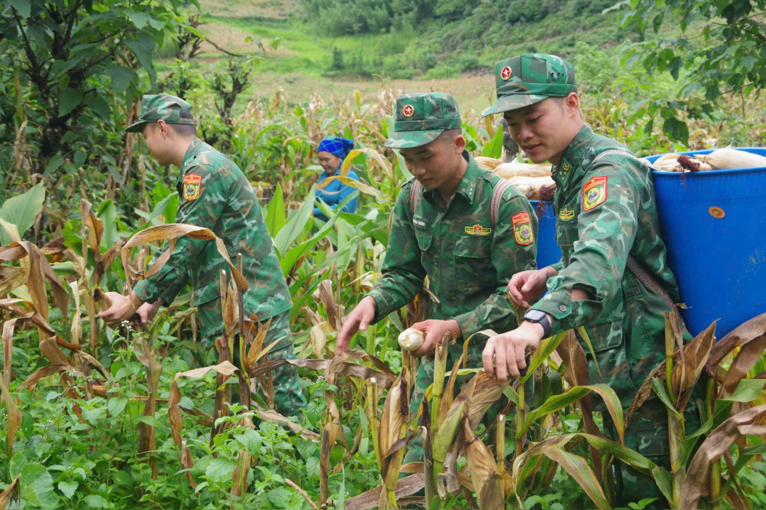 Cán bộ chiến sĩ đồn Biên phòng Đàm Thuỷ giúp dân thu hoạch vụ mùa.