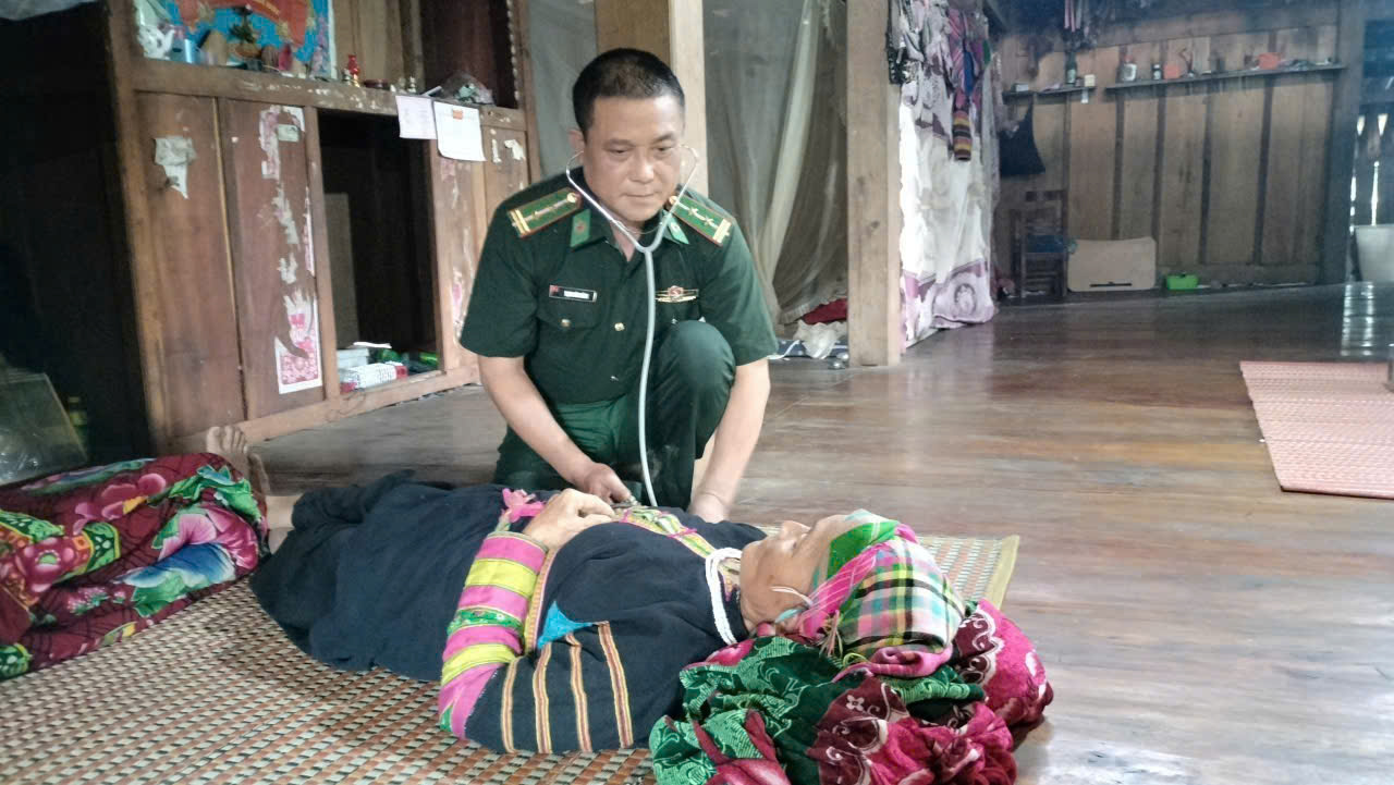Quân y đồn Biên phòng Cốc Pàng thăm, khám bệnh, cấp thuốc miễn phí cho mẹ liệt sĩ do đơn vị nhận phụng dưỡng.