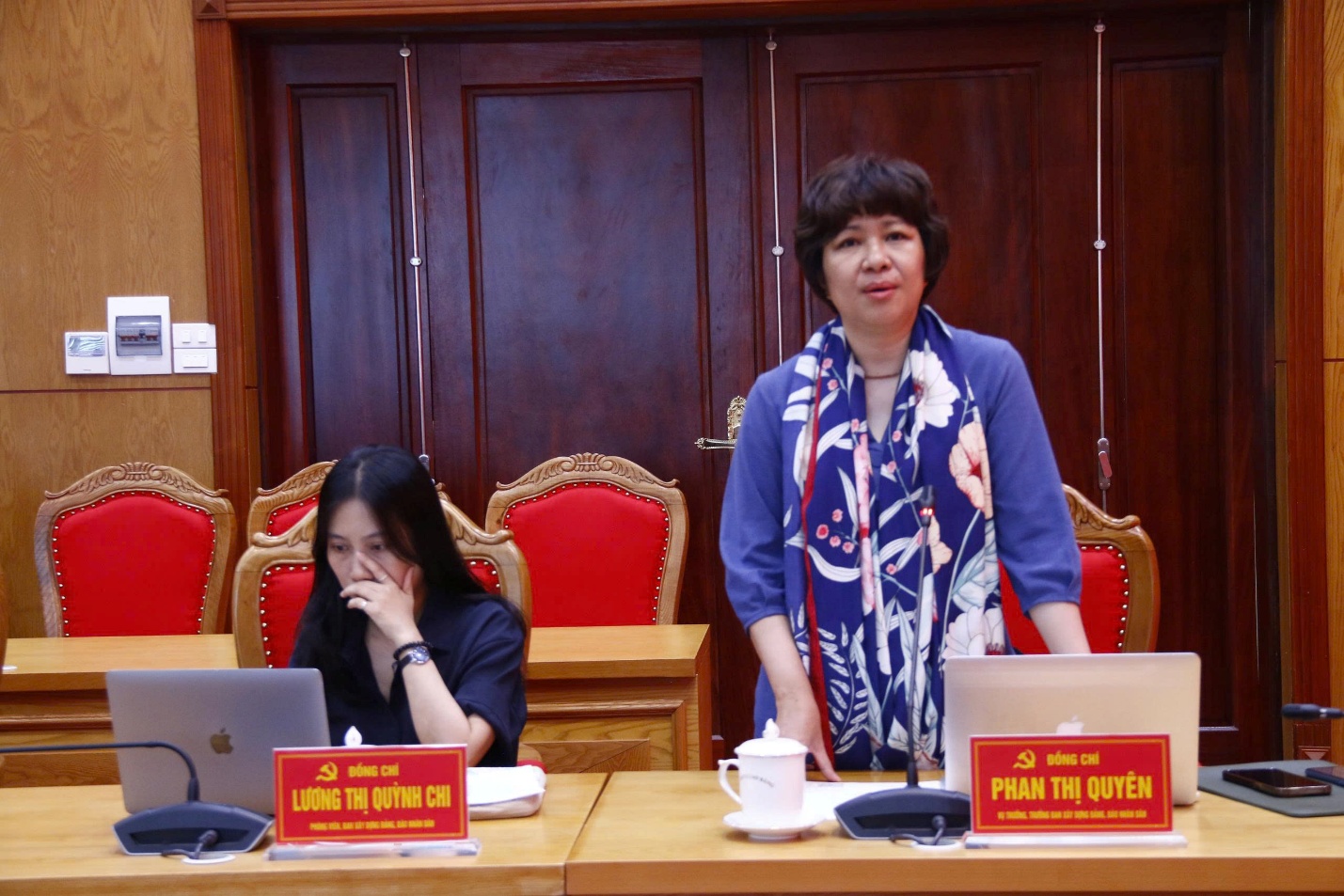 Đồng chí Phan Thị Quyên, Vụ trưởng, Trưởng Ban Xây dựng Đảng, Báo Nhân dân phát biểu tại buổi làm việc.